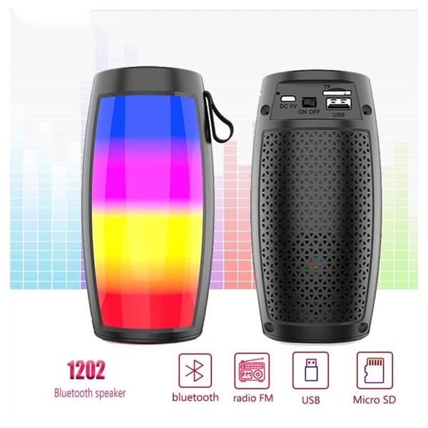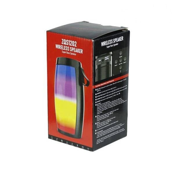 اسپیکر بلوتوثی رم و فلش خور ZQS 1202 یک اسپیکر با باند 2 اینچی و توان خروجی 5 وات است. نسبت سیگنال به نویز 50 دسی بل و فرکانس پاسخ آن در بازه 45 هرتز الی 18 کیلو هرتز است. پشتیبانی از اتصالات بی سیم نظیر بلوتوث تا برد 10 متر، پشتیبانی از کارت حافظه، فلش USB و پشتیبانی از رادیو FM از امکانات این اسپیکر می باشد. همچنین دارای کلید خاموش و روشن اسپیکر، کلید های مدیریت صدا، پخش موسیقی و تغییر حالات نورپردازی اسپیکر می باشد.