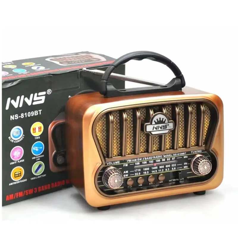 رادیو اسپیکر NNS NS-8109BT جزو اون دسته از وسایلی هستند که علاوه بر پخش کانال های رادیویی با توجه به سبک و طرحی که دارند می توان از آنها به عنوان یک وسیله لوکس و دکوری در منزل و یا حتی محل کار استفاده کرد. این رادیو ها با توجه به امکانات بروزی که دارند مانند یک سیستم پخش حرفه ای عمل می کنند و شما رو برای گوش دادن آهنگ های مورد علاقه همراهی می کنند. این محصول مناسب برای پخش راديو و فايل هاي صوتي با تکنولوژي بلوتوث و همچنین اتصال AUX و USB را دارا میباشد و میتوانید از این امکانات تعبیه شده در این محصول نهایت استفاده راببرید. طراحی این مدل شبیه به رادیوهای قدیمی است اما قابلیتهای مدرنی دارد که آن را به یک دستگاه کاربردی تبدیل کردهاند.