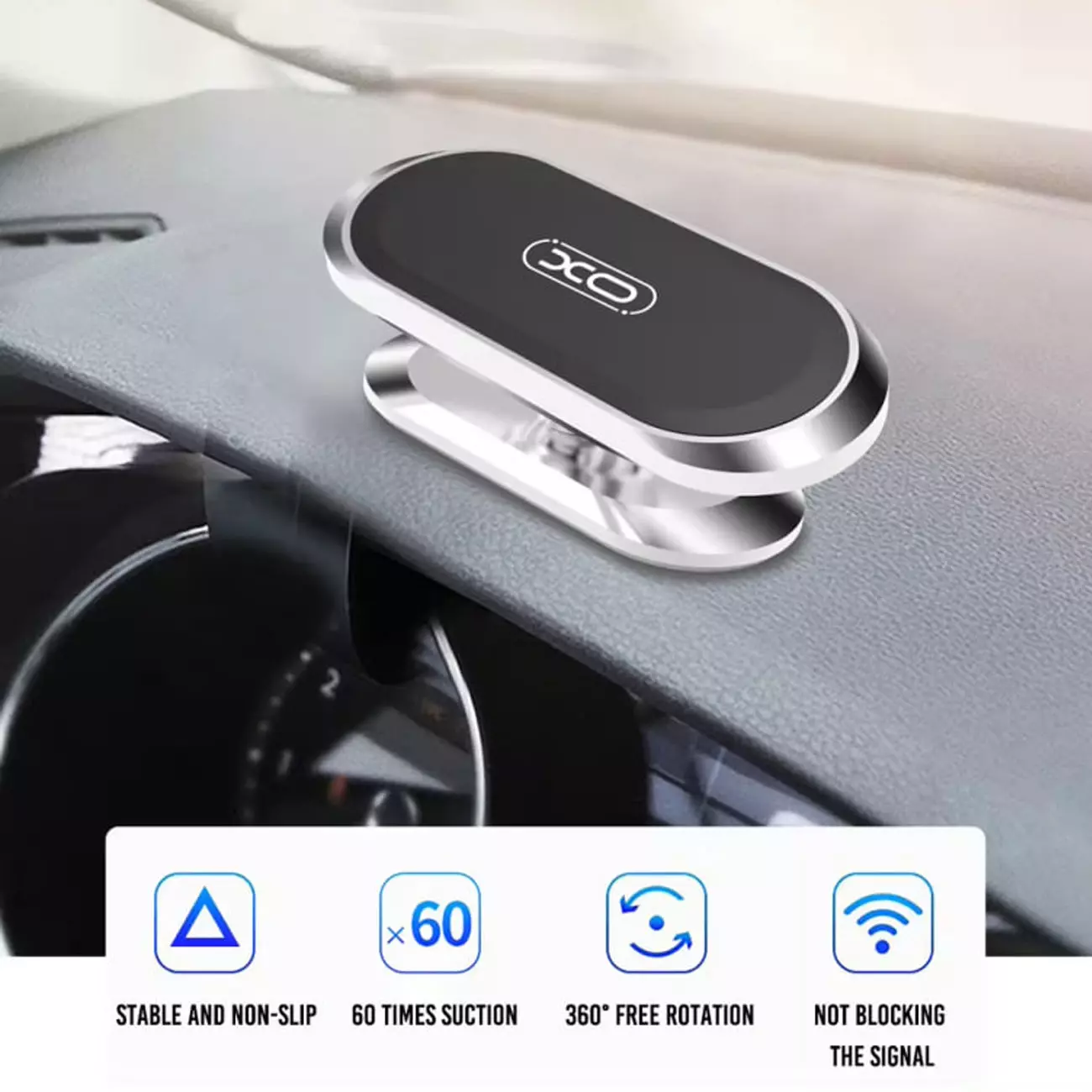 پایه موبایل داخل ماشین مگنتی ایکس او با استفاده از آهنربا اتصال مغناطیسی قوی را فراهم کرده است؛ آهنربای نئودیمیوم مکش قوی تری را ارائه میدهد. همچنین قسمتی که به داشبورد متصل میشود دارای چسبی قوی است که در برابر گرما مقاوم است.