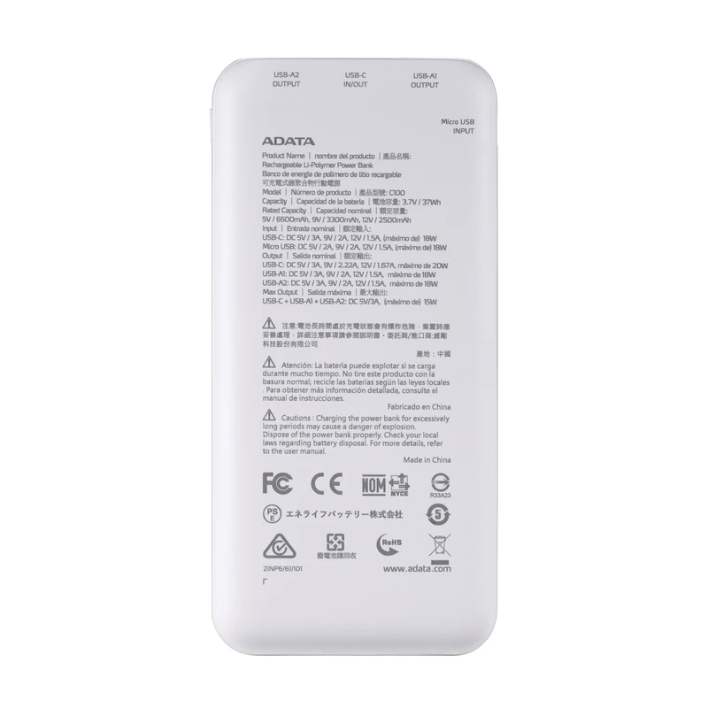 شارژر همراه «ای دیتا» مدل «C100» محصولی نازک، سبک و خوشدست است که با روکش مقاوم روانه بازار شده است. این پاوربانک دارای دو درگاه خروجی USB است و یک ورودی TIPE – C و بدنه مقاوم در برابر حریق دارد. با این مدل پاوربانک می توانید گوشی موبایل را سریعتر شارژ کنید و خود پاوربانک را هم سریعتر شارژ کنید. باتری پاوربانک C100 ظرفیتی معادل 10000 میلیآمپرساعت دارد و از نوع لیتیوم-پلیمر است. در صورت پر بودن این باتری چهار عدد نشانگر روی بدنه پاوربانک روشن خواهند بود. این پاوربانک دارای الگوی پوششی برای مقاومت در برابر سر خوردن و گریپ بهتر است. همچنین مقاوم در برابر اثرانگشت و لکه است. این پاوربانک قابلیت شارژ سه دستگاه به طور همزمان را دارد و از شارژ سریع PD/QC 20 واتی پشتیبانی می کند