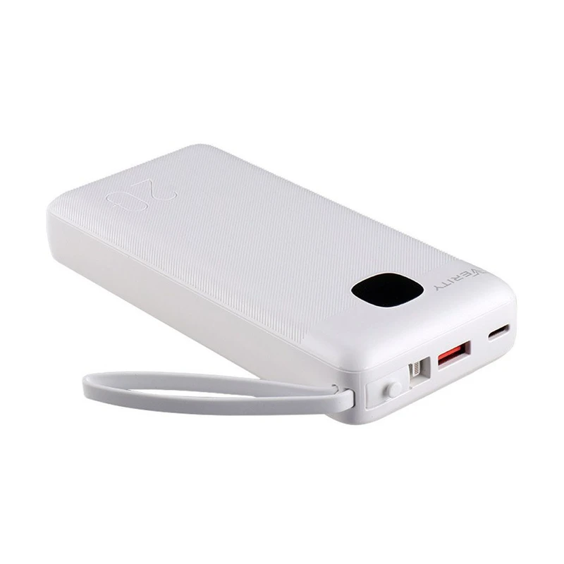 پاور بانک فست شارژ ۲۰۰۰۰ وریتی Verity V-PH۱۴۵W-۲۰PD QC۳.۰ PD ۲۲.۵W شارژر همراه فست شارژ وریتی مدل V-PH۱۴۵W-۲۰PD با ظرفیت ۲۰۰۰۰ میلی آمپر ساعت باتری پاوربانک از نوع لیتیوم پلیمری با ظرفیت ۲۰۰۰۰ میلی آمپر ساعت قابل شارژ توسط کابل USB متصل به بدنه و درگاه Type-C (مشترک) تعبیه شده بر روی بدنه دارای ۱ عدد پورت خروجی USB و ۱عدد پورت تایپ سی (مشترک) و ۳ عدد کابل متصل تایپ سی، لایتنینگ و USB، با پشتیبانی از فناوری Power Delivery و QC۳.۰ کابل لایتنینگ متصل با شدت جریان خروجی ۲.۴ آمپر در ولتاژ ۵ ولت و کابل تایپ سی متصل با ولتاژ خروجی ۵/۹/۱۲ ولت با توان خروجی ۲۰ وات میزان ولتاژ خروجی درگاه USB برابر با ۵/۹/۱۲ ولت با توان ۲۲.۵ وات، ولتاژ ورودی کابل USB متصل معادل ۵/۹/۱۲ ولت با توان ورودی ۱۸ وات بدنه ساخته شده از متریال پلاستیکی مقاوم در برابر آسیب های فیزیکی، دارای یک کلید فیزیکی به منظور روشن خاموش کردن پاوربانک نمایشگر LED به منظور آگاهی از باقیمانده ی شارژ، موفق به دریافت استانداردهای ایمنی و سلامت محصول CE ،FCC محافظت از دستگاه متصل شده در برابر تخلیه شارژ و جریان و شارژ بیش از حد، قابلیت مدیریت هوشمند مقدار ولتاژ ورودی و خروجی درگاه Type-C معادل ۵/۹/۱۲ ولت با توان ورودی ۱۸W و خروجی ۲۰W